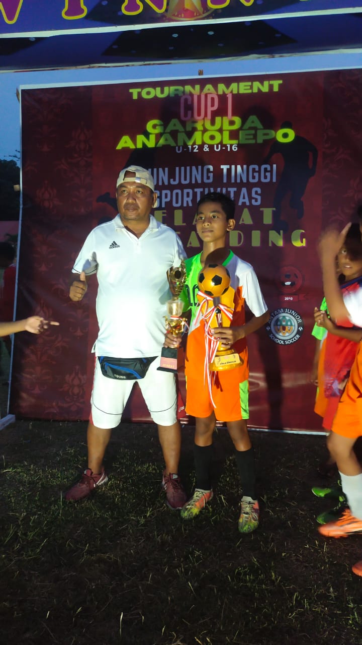 Pelatih Jamrin saat Foto Bersama Kapten Kesebelasan SSB Elang United Edy Shiro Arwis Usai Penerimaan Piala.