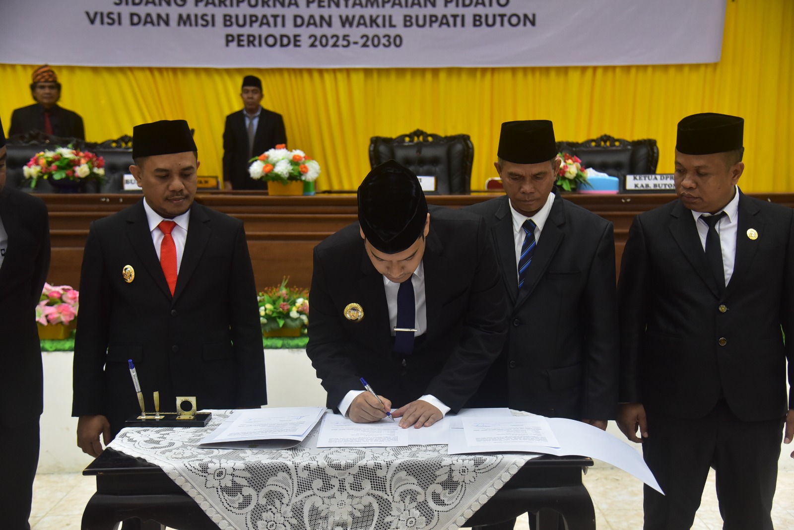 Roda pembangunan di Kabupaten Buton selama 5 tahun ke depan akan berjalan sesuai dengan visi kami, terwujudnya masyarakat yang religius, sejahtera, mandiri dan berdaya saing melalui pembangunan yang berkelanjutan (Buton Bersinar) dengan beberapa misi yang akan kami uraikan secara gamblang pada rapat paripurna sesaat lagi.
