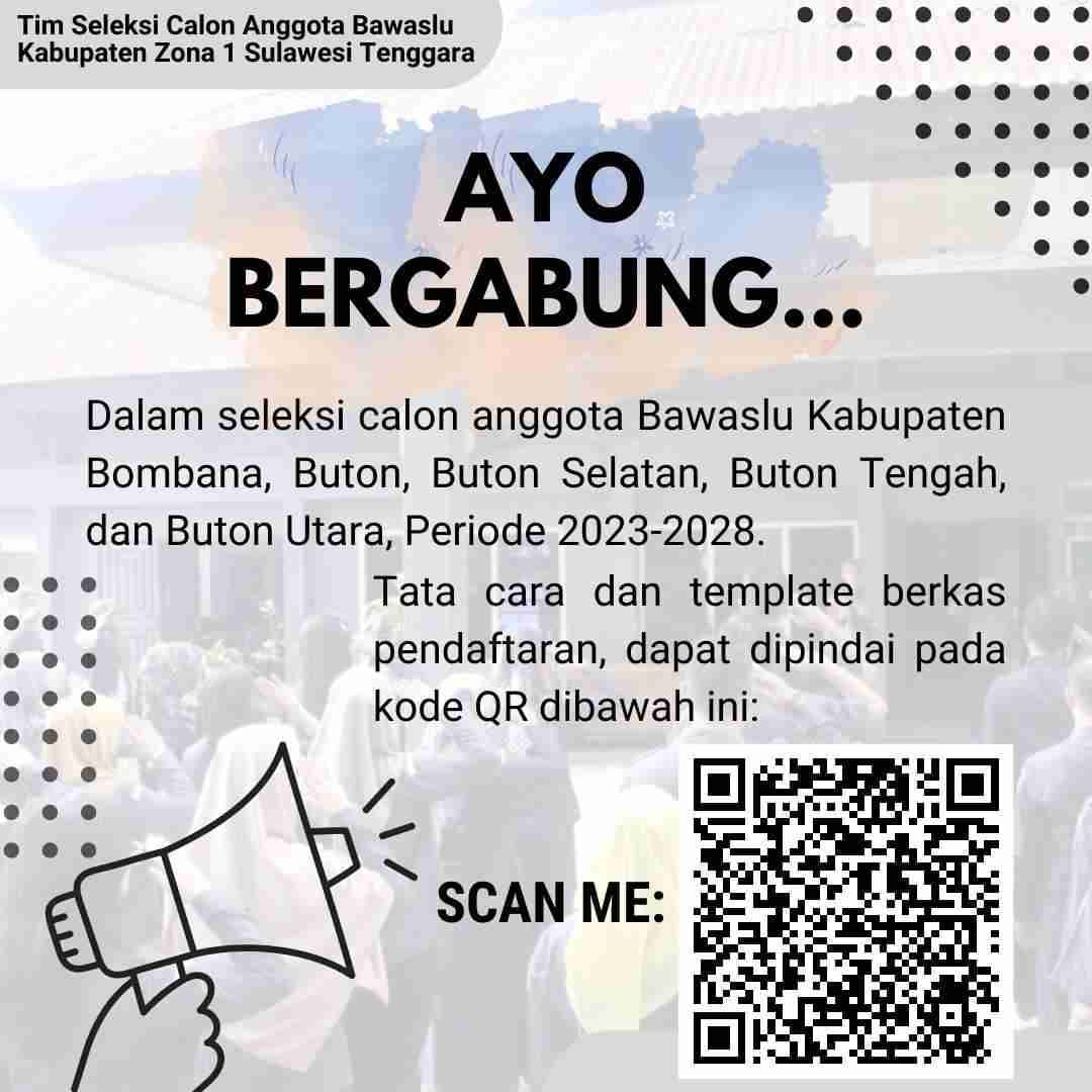 AYO BERGABUNG…..Dalam seleksi calon anggota Bawaslu Kabupaten Bombana, Buton, Buton Selatan, Buton Tengah, dan Buton Utara, Periode 2023-2028. Adapun ketentuan pendaftaran serta tata cara dan template berkas pendaftaran, dapat didownload pada link dibawah ini: