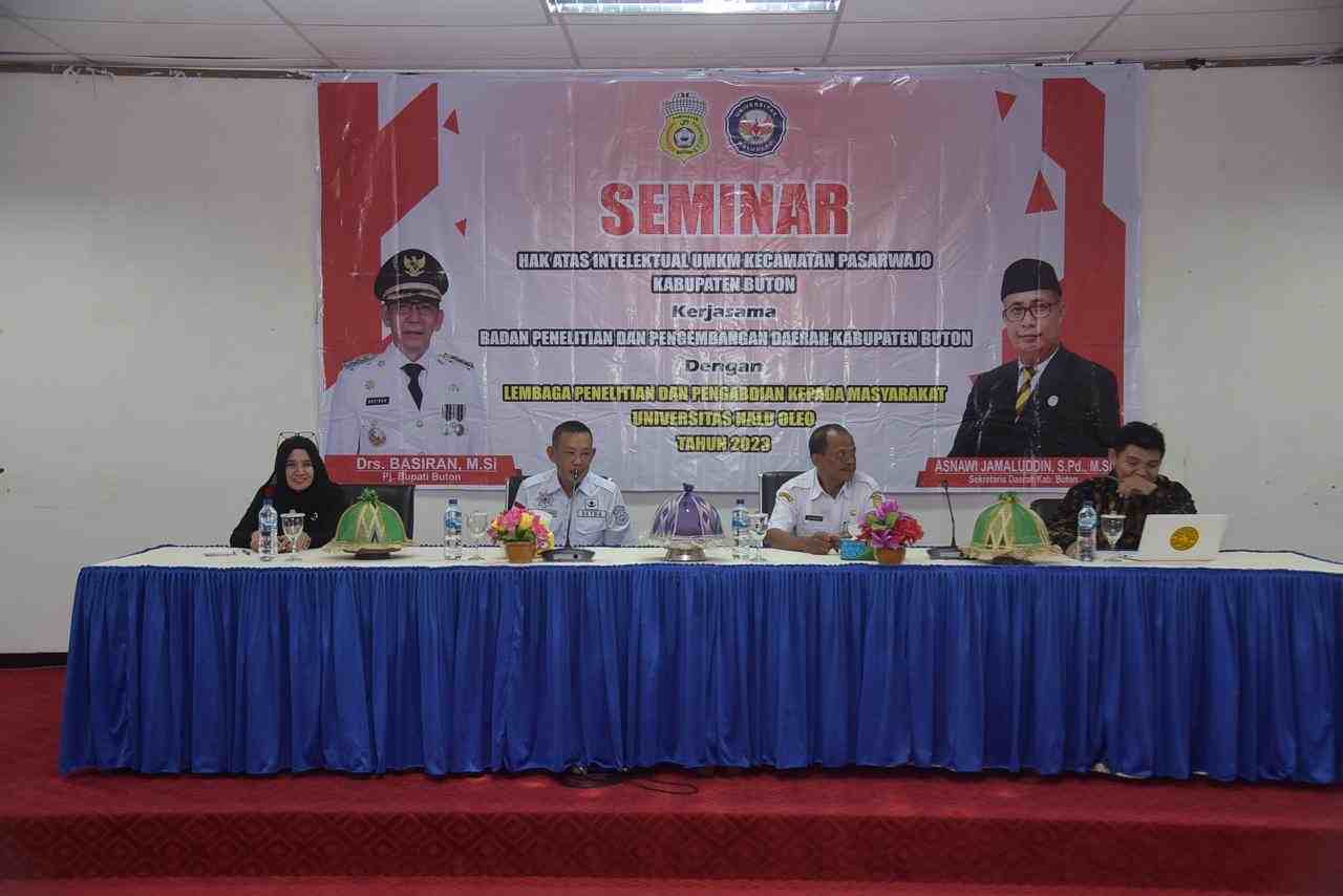 Hal itu dikatakan Pj. Bupati Buton, Basiran melalui Asisten Administrasi Umum Sekda Kabupaten Buton, La Ode Muhidin Mahmud ketika menyampaikan Seminar Hak Atas Intelektual UMKM di Kecamatan Pasarwajo dengan Lembaga Peneltian dan Pengabdian kepada Masyarakat, Universitas UHO di Aula Kantor Bupati Buton, Kompleks Perkantoran Takawa, Rabu, 12 Juli 2023.
