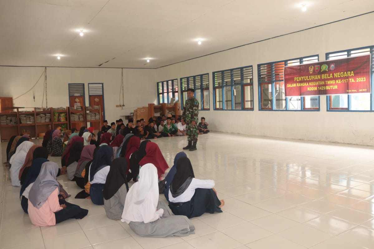 Butur, Penaaktual.id– Tentara Manunggal Masuk Desa (TMMD) ke-117 Kodim 1429/Butur tahun 2023 selain mengerjakan sasaran fisik, juga melakukan kegiatan non fisik berupa penyuluhan wawasan kebangsaan dan bela negara pada siswa Pesantren SMK Bahrul Ulum yang bertempat di Aula SMK Bahrul Ulum , Selasa 18 Juli 2023.