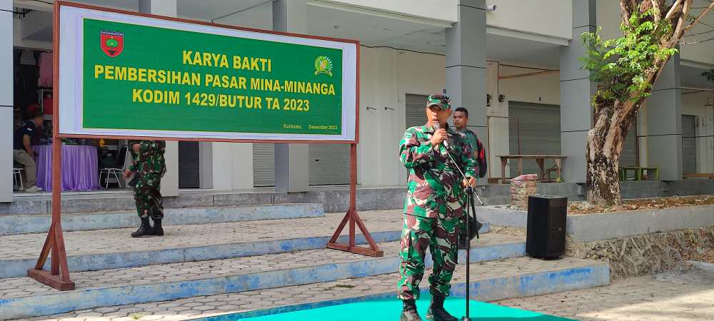 Dandim 1429/Butur Letkol Inf Acuk Andrianto, SE mengatakan memasuki musim penghujan dengan exsistensi yang tinggi. TNI bersama Polri, Badan Penanggulangan Bencana Daerah (BPBD), Satuan Polisi Pamong Praja (Satpol-PP), Badan Lingkungan Hidup (BLH), Siswa SMP, Ibu Persit Dim 1429 dan masyarakat setempat bergotong royong membersihkan halaman kompleks pasar Minaminanga.